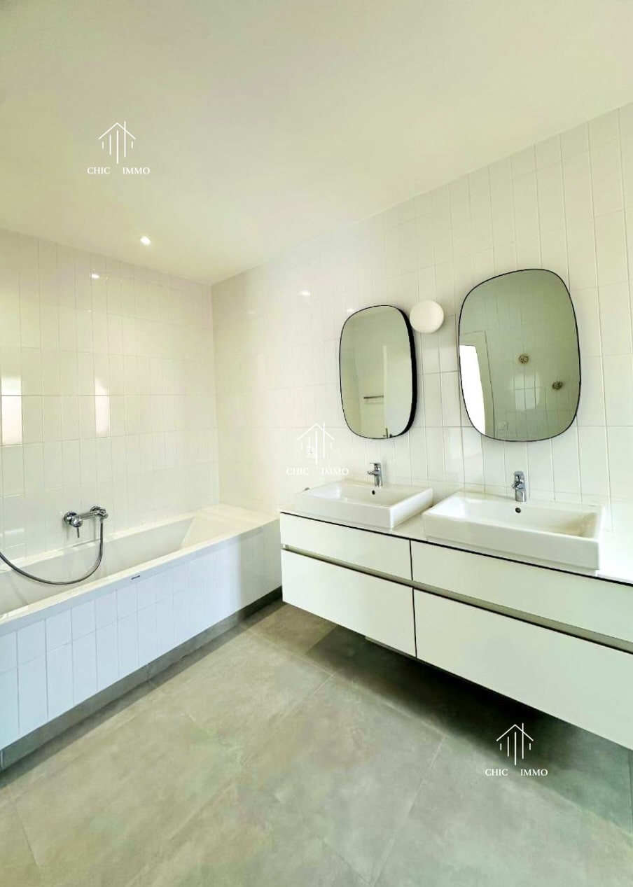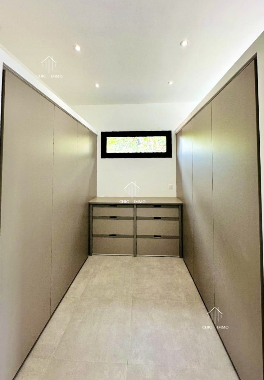 The ground floor features a large, bright living room opening onto a bay window, an American-style kitchen complemented by a service kitchen, a laundry room, a guest toilet, and a bedroom equipped with closets, its own shower room and toilet.