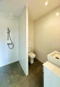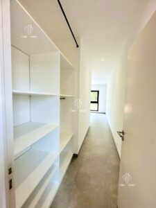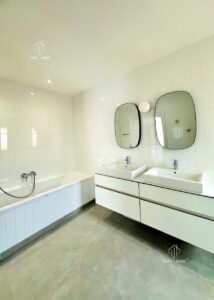 Upstairs, a mezzanine serves as a multi-purpose living room. The master suite features an en-suite bathroom with shower and bathtub, a separate toilet, a dressing room, and a balcony. Two additional bedrooms, each with built-in wardrobes, have their own en-suite bathroom with toilet.